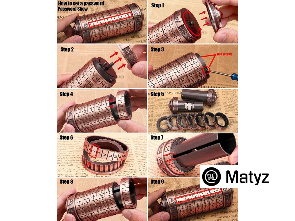 CRYPTEX sa dá otvoriť iba heslom zloženým z jednotlivých 6 písmen, ktoré musí obdarovaný zadať na otáčavom valci. (pôvodné heslo vám zašleme do e-mailu a následne si ho môžete sami zmeniť-navoliť na iné, ktoré vám bude vyhovovať.) Bez hesla sa nedá Cryptex otvoriť.